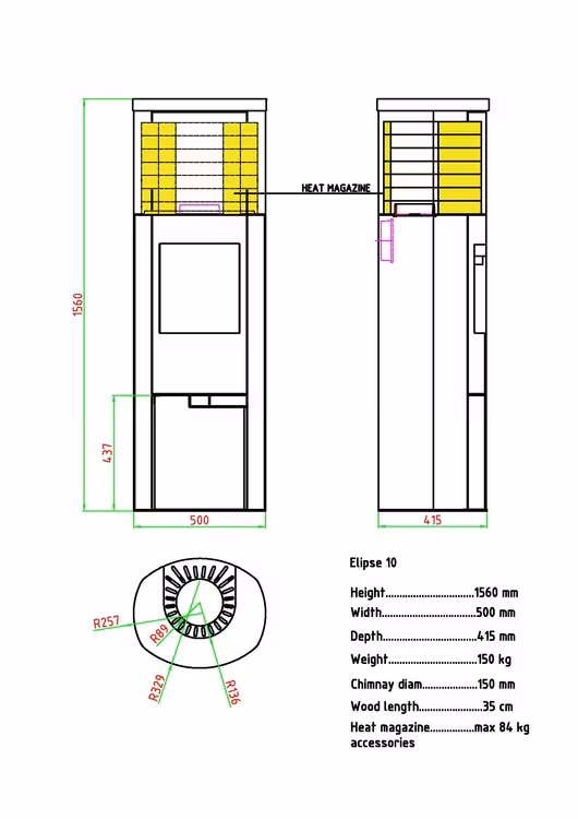 Kaminen levereras i standardutförande med en topp av stål, sten topp finns som tillval.