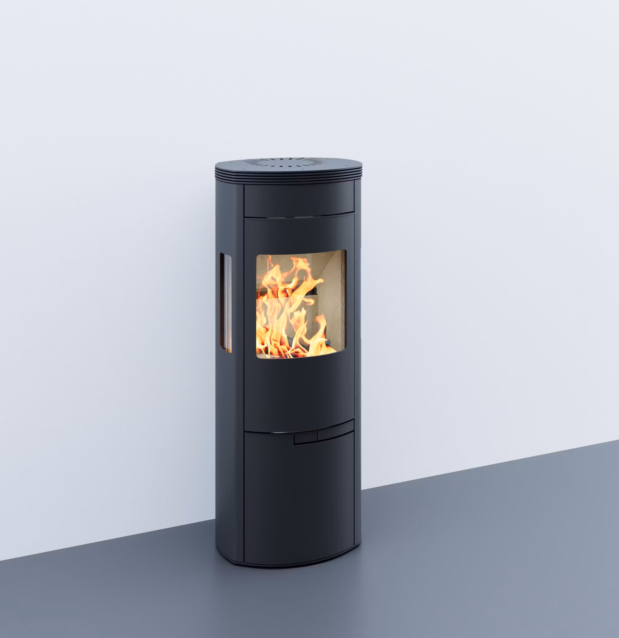 Ett stort tilltalande frontglas pryder kaminen samt två välplacerade sidoglas för full insyn till brasan även från sidan.