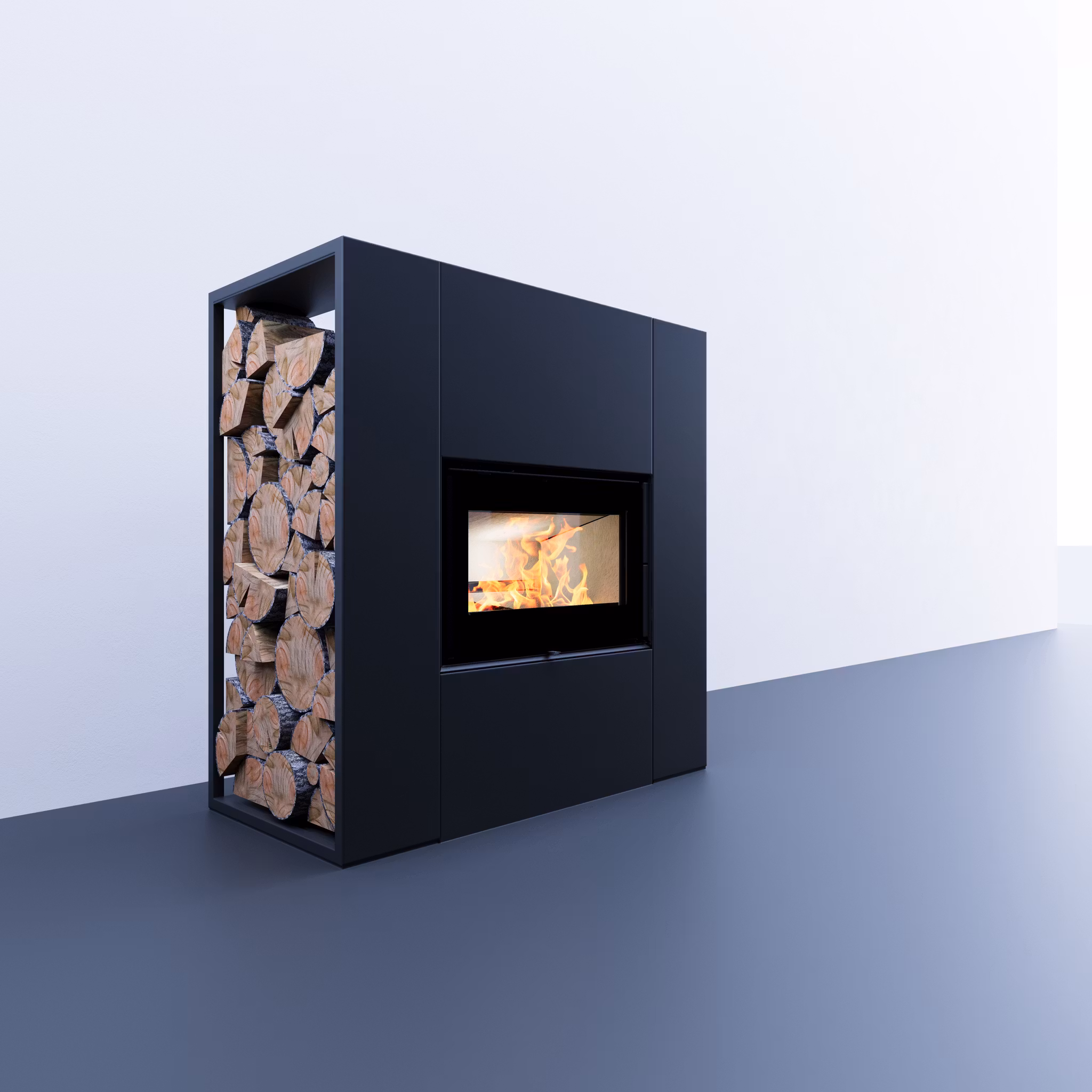 I den bakre delen av eldstaden finns en integrerad del för vedförvaring som kan ses när man tittar från sidan av eldstaden.