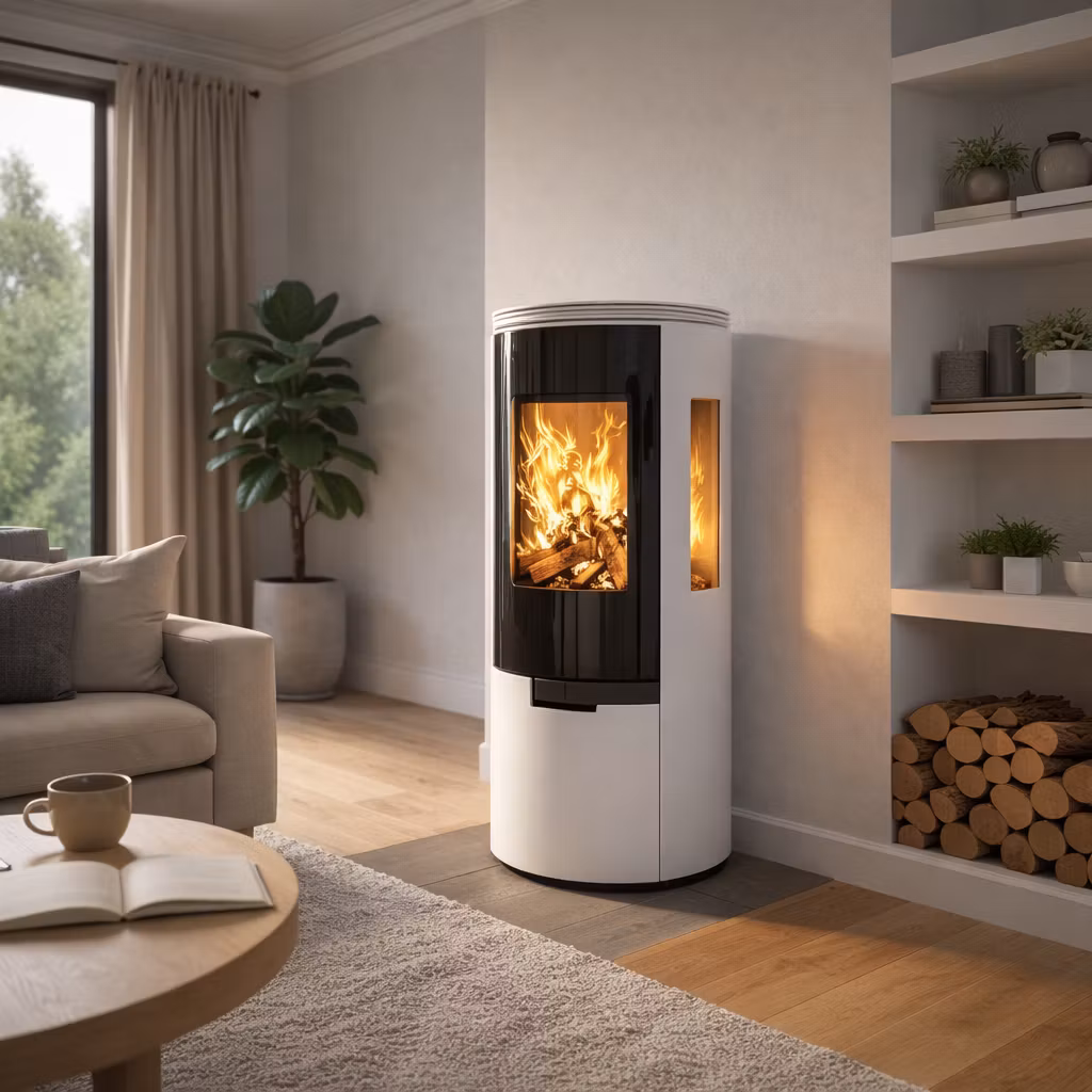 En välgjord braskamin i enkelt formspråk med viktiga detaljer. Elippsen 2E White gör den extra lämpad för placering vid en rak vägg men passar lika bra fristående som i ett hörn.