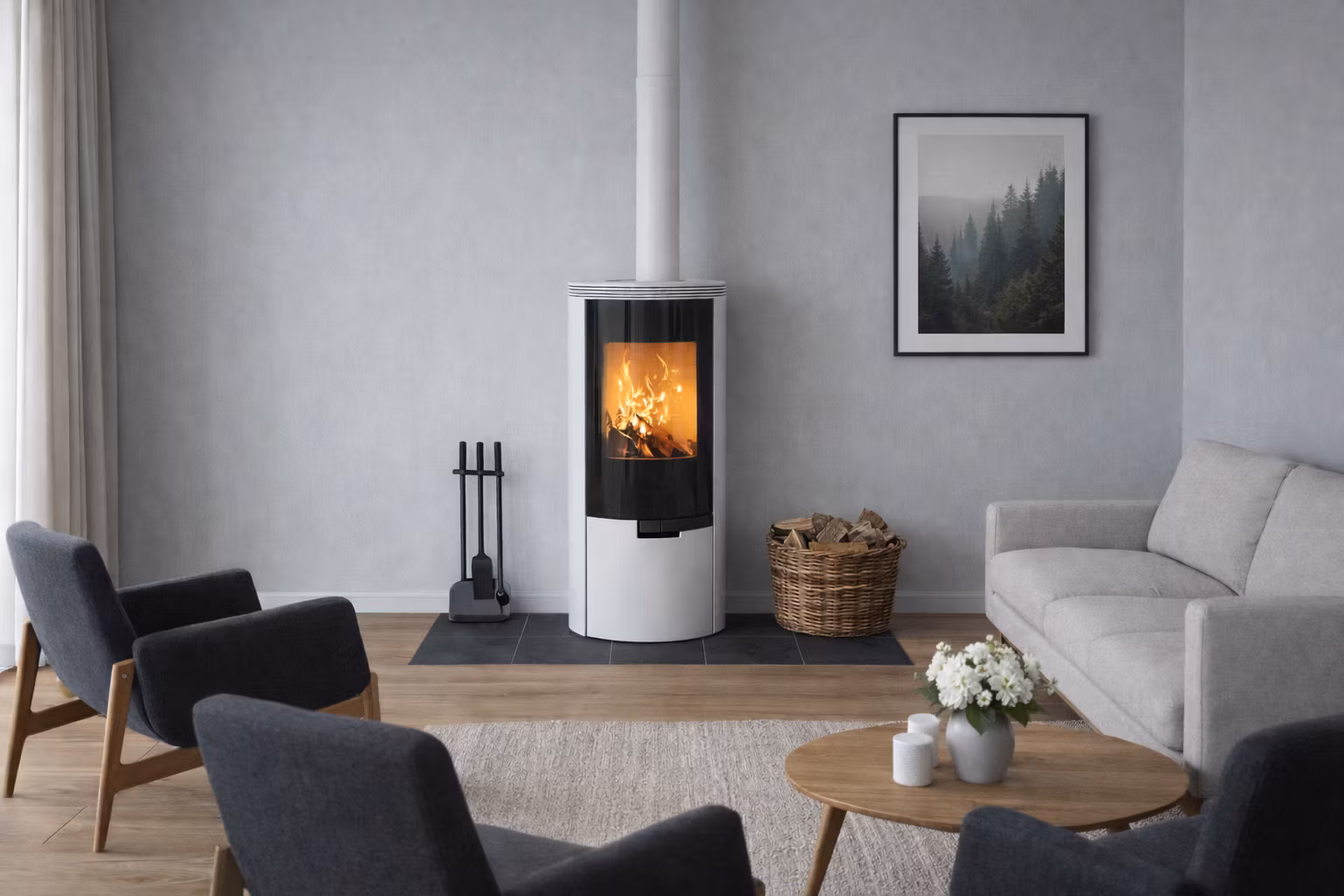 En elegant eldstad Elippsen 6 E White är lätt att placera tack vare sin kompakta storlek.